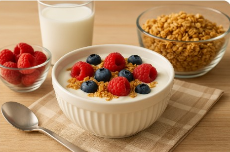 - 아침: 귀리 오트밀 + 블루베리 + 호두 + 무가당 요구르트 한 스푼